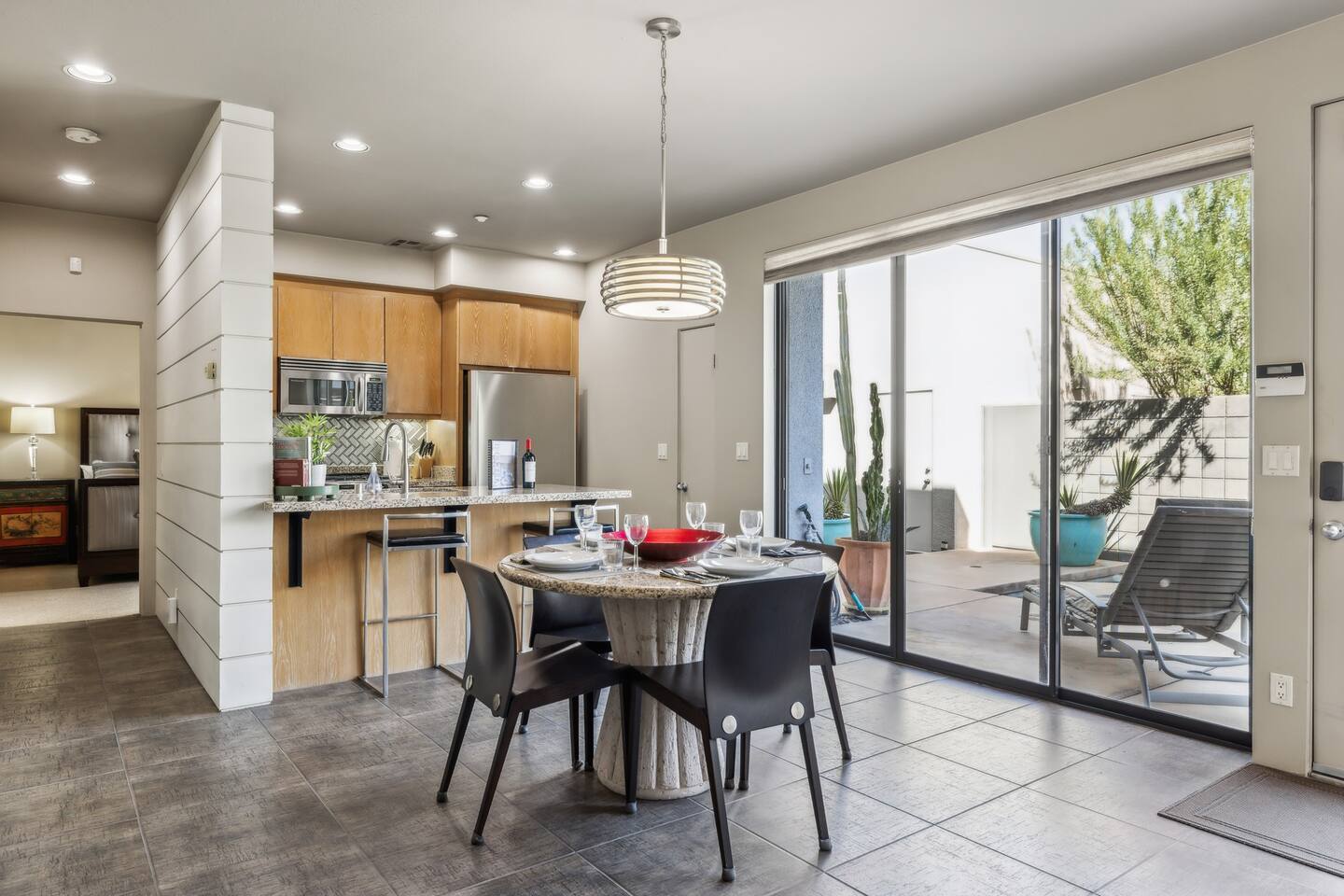 Welcome to one of the most modern gated communities in Palm Springs! Nestled in the heart of the city, our home provides convenient access to shopping, dining, and entertainment. With soaring ceilings, the expansive great room combines the living room, dining area, and a stylish open kitchen featuring high-quality stainless steel appliances, tile flooring, and elegant granite countertops. Step into the enclosed courtyard to find a private pool and spa, seamlessly accessible through sliding glass doors, creating a serene indoor/outdoor retreat. A striking staircase leads to the second-floor Master Suite, complete with a balcony overlooking the pool, as well as a Loft/Den that offers a view of the great room below. The home is elegantly furnished with classic mid-century pieces throughout. The Great Room features a gas fireplace and wood-beamed ceilings, perfectly complementing the adjacent dining and kitchen area. On the main floor, you'll find an ensuite bedroom for added convenience. Ascend the staircase to discover a Loft/Den, complete with its own full bath, closet, and cable television. From the loft, enjoy a sweeping bird's-eye view of the Great Room below. The second floor also boasts another full-sized ensuite bedroom, featuring a private balcony and walk-in closet. For your convenience, a stackable washer and dryer is located in the hall closet. High speed Wi-Fi Internet access throughout. **Luxuriate in the Palm Springs Lifestyle:** **Outdoor Activities:** - Golf - Tennis - Hiking - Horseback Riding **Palm Springs Aerial Tramway:** - Ascend to 8,516 feet at Mount San Jacinto. - Explore a State Park with breathtaking views of the valley, San Andreas Fault, and Salton Sea. **Cultural Attractions:** - Visit the Palm Springs Desert Museum. - Explore the nearby Spa Resort Hotel & Casino, featuring fine dining, gaming, and natural healing waters. **Shopping and Dining:** - Discover world-class golf courses and a variety of shops and restaurants just minutes away from our residence. **Smart Shopping:** - Desert Hills Premium Outlet Mall: 20 minutes away in Cabazon, with over 120 designer stores. - “El Paseo” in Palm Desert, known as the “Rodeo Drive” of the Desert. **Unique Experiences:** - Spend time at The Living Desert, a one-of-a-kind botanical park and wildlife experience. Average seasonal temperatures: January: Highs 72 °F, Lows 40 °F April: Highs 87 °F, Lows 52 °F July: Highs 108 °F, Lows 73 °F October: Highs 91 °F, Lows 57 °F